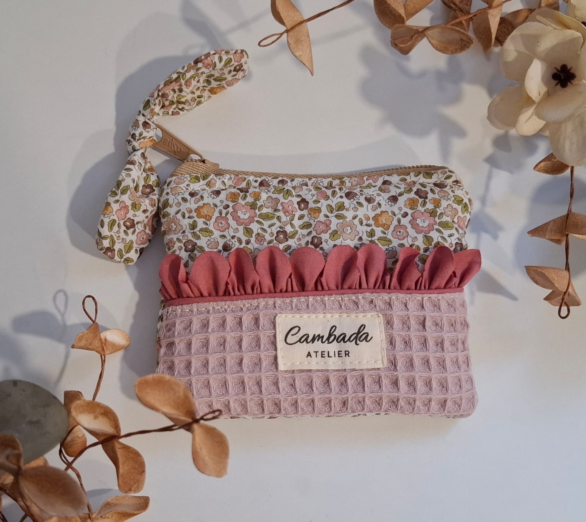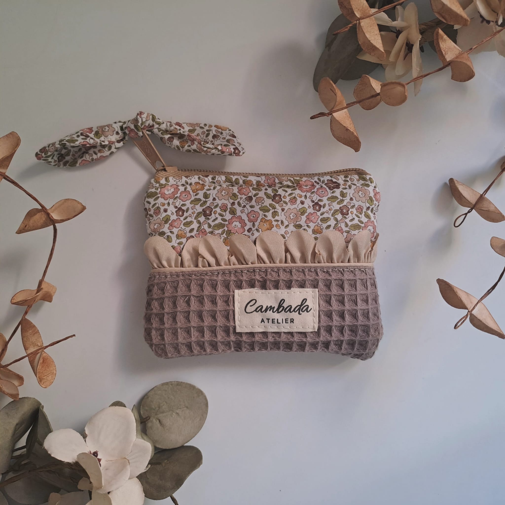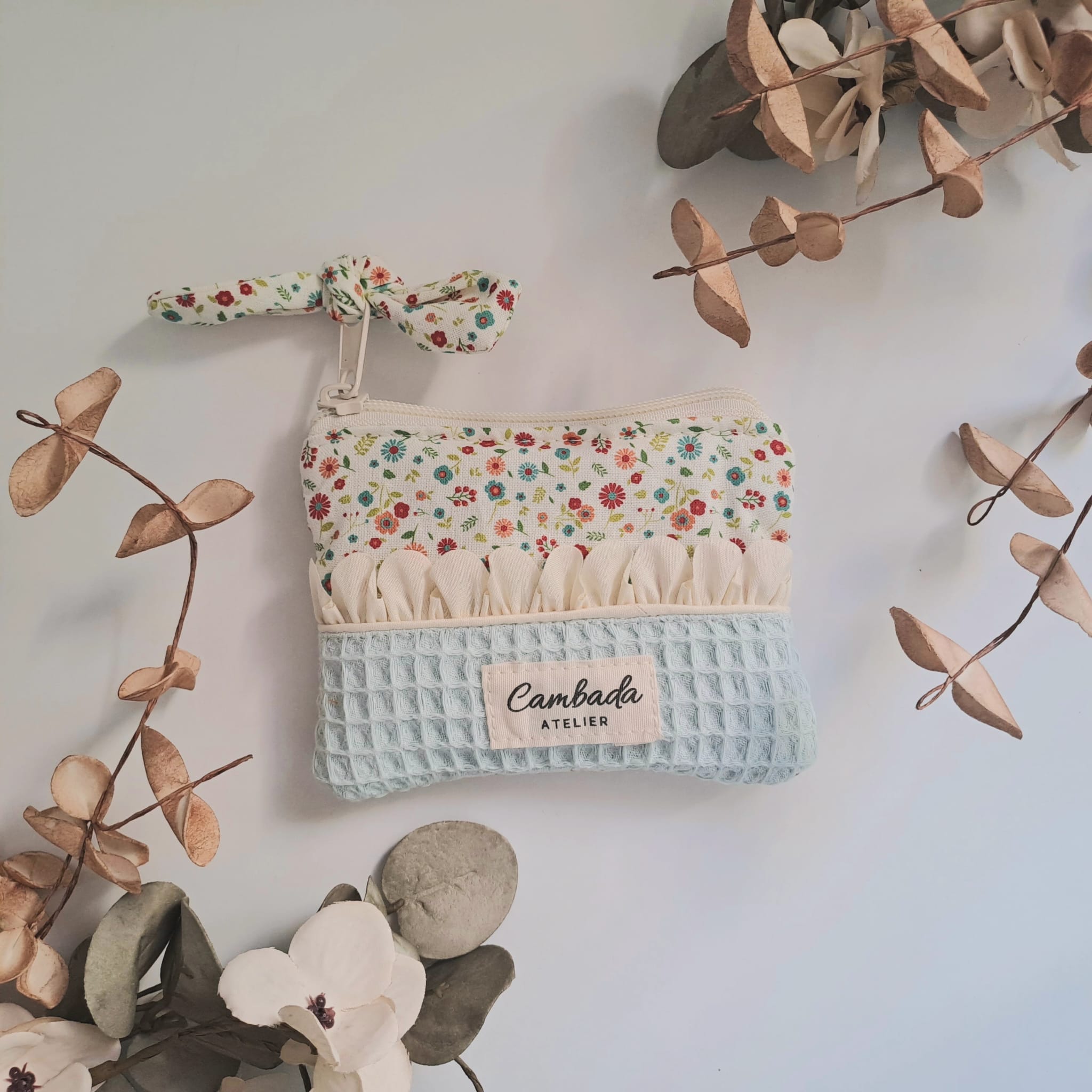 Nuestro monedero Pouchy está elaborado a mano en tejido waffle de algodón y decorado con un delicado detalle de flores que aporta un aire romántico y fresco.